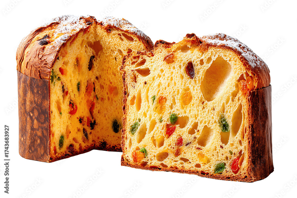 Golden panettone loaf with visible candied fruit pieces, two slices arranged casually against it, fine crumbs around, isolated on transparent background. #1743683927
