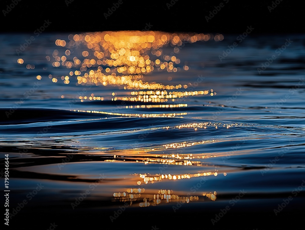Golden reflections shimmer across the darkening water, each gentle wave catching scattered points of light as the last glow of sunset drifts into the night #1795046644