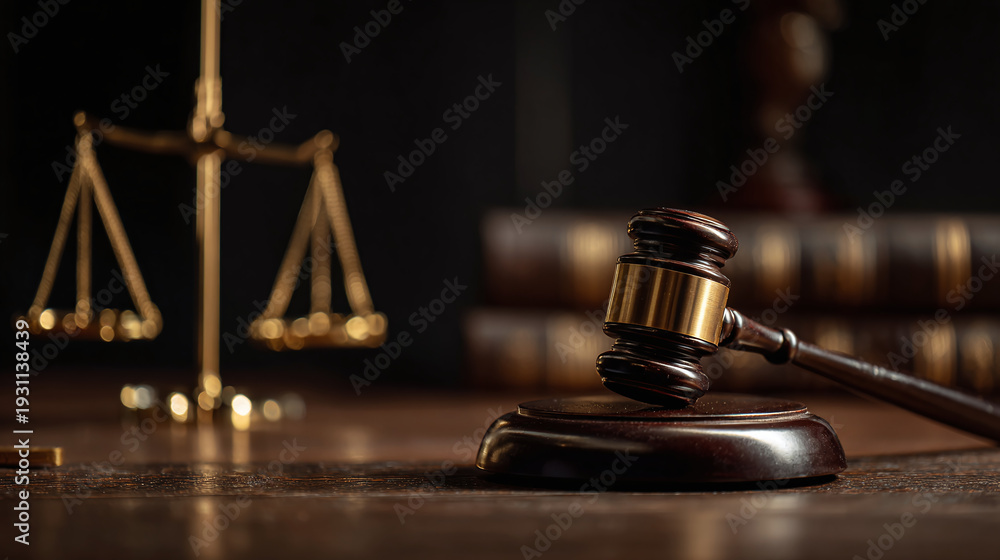 golden scales of justice with judge gavel on lawyer desk representing legal system law court proceedings balance fairness and legal profession office environment #1931138439