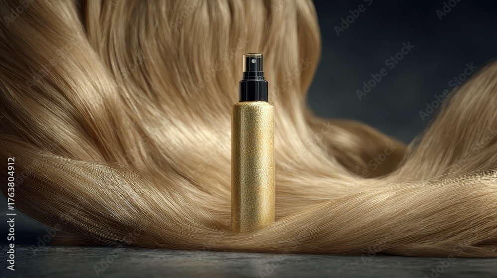 Golden spray bottle on flowing blonde hair representing effective haircare and beauty products for healthy, shiny, and styled results #1763804912
