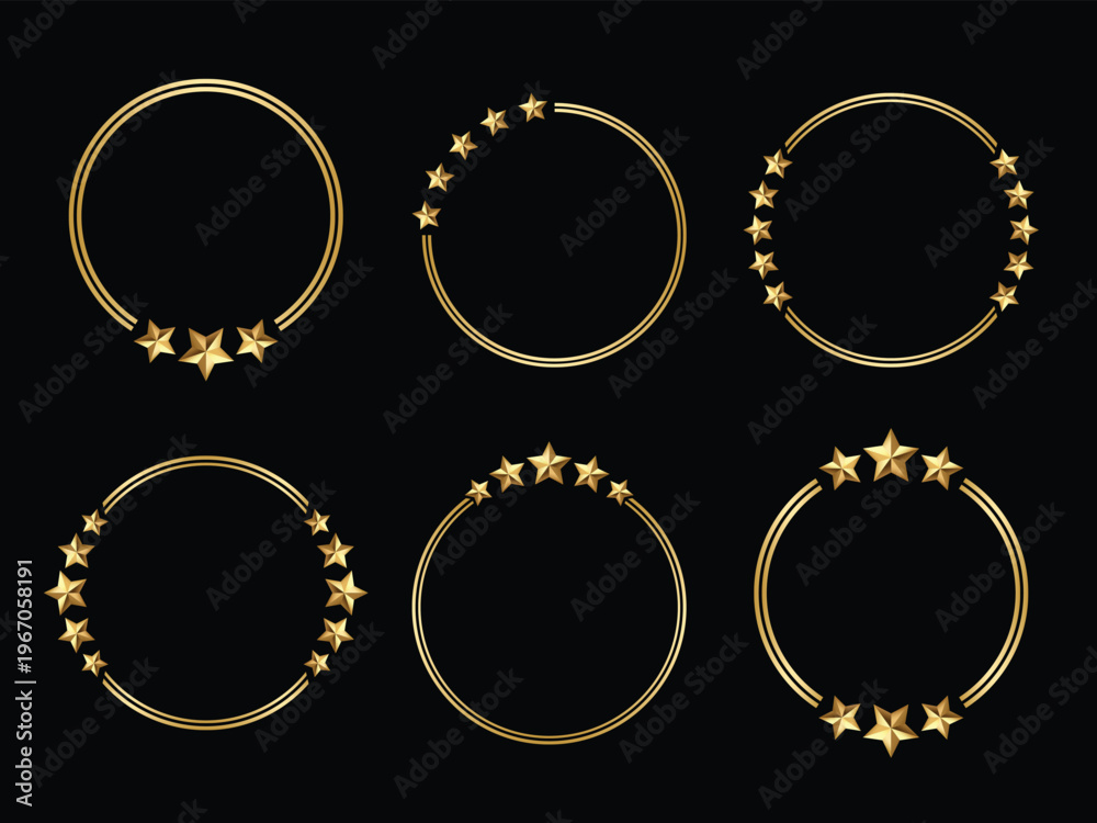 Golden stars frame border set round circle black background collection Stars shine with warm, polished texture. Ideal for luxury, celebration, or achievement themes #1967058191