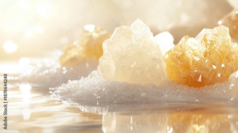 Golden sugar crystals on a bed of white sugar, glistening water #1878644240