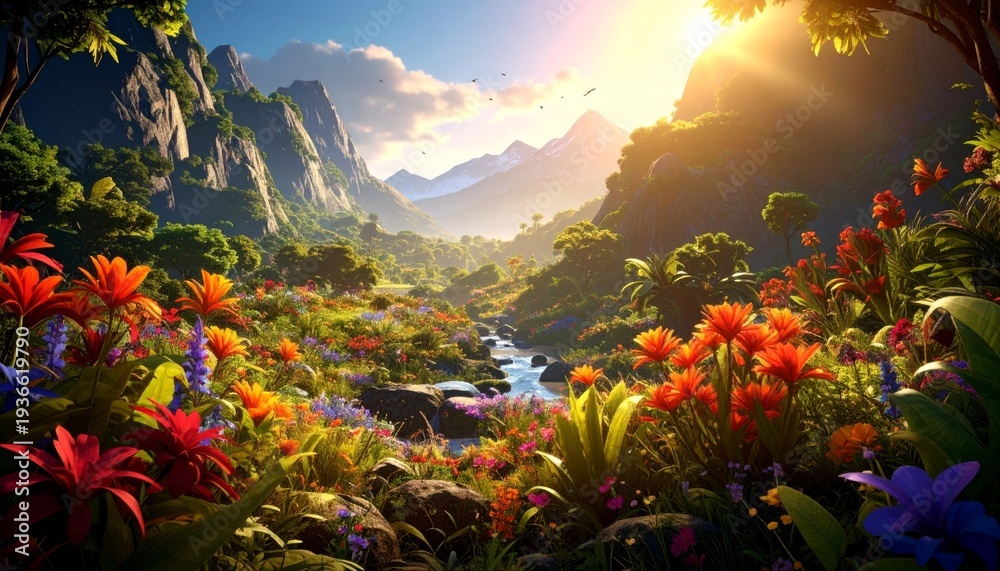 Golden Sunrise Over a Hidden Valley of Vibrant, Blooming Wildflowers #1936619790