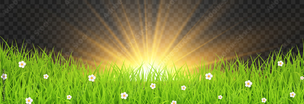 Golden sunrise over green grass field with sun rays isolated on transparent png background, spring meadow nature vector illustration #1925157300