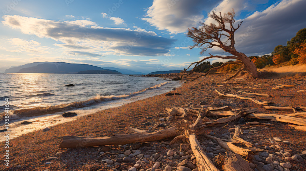 Golden sunset casts vibrant colors over a rocky beach, as gentle waves lap against stones and driftwood lays scattered along the shoreline, creating a peaceful atmosphere. #1758141634