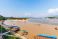 Golden Triangle area where Thailand, Laos, and Myanmar meet. A scenic river view with boats along the muddy banks, mountains in the distance, and clear blue sky creating a peaceful border atmosphere. #1417305483