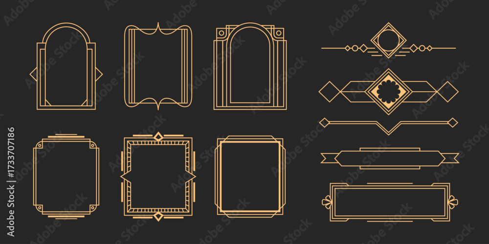 Golden vintage frames vector set. Luxury deco design in line art. Ar deco gatsby style elements. #1733707186