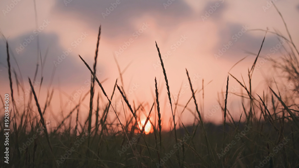 Golden wheat field at sunset with sun flare and dramatic evening sky #1920340620