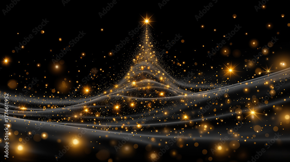 Goldener leuchtender Weihnachtsbaum mit Sternen und Lichteffekten auf dunklem Hintergrund #1774611952