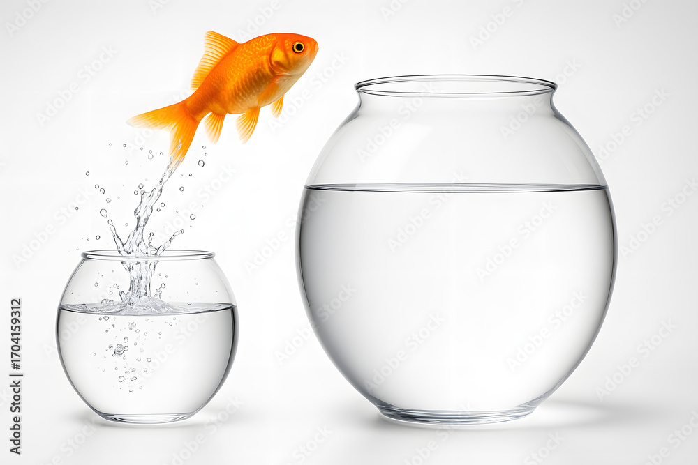 Goldfish jumping from small bowl to big bowl, concept of opportunity growth and success, motivation leap for progress, change and achievement in life, business challenge overcoming barrier and ambitio #1704159312