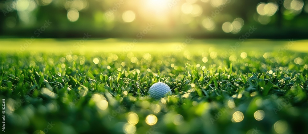 Golf ball resting on lush green grass at sunset. (1) #1316222683