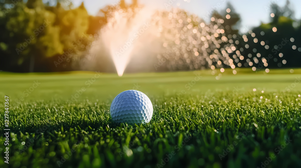 Golf Course Close-Up: Ball, Sprinkler, and Sunlit Trees #1277347367