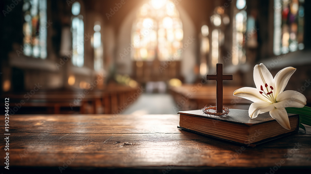 Good Friday, Good Friday Church Interior With Wooden Cross, Open Bible, White Lily Flower, And Soft Morning Light Symbolizing Christian Faith #1902946012