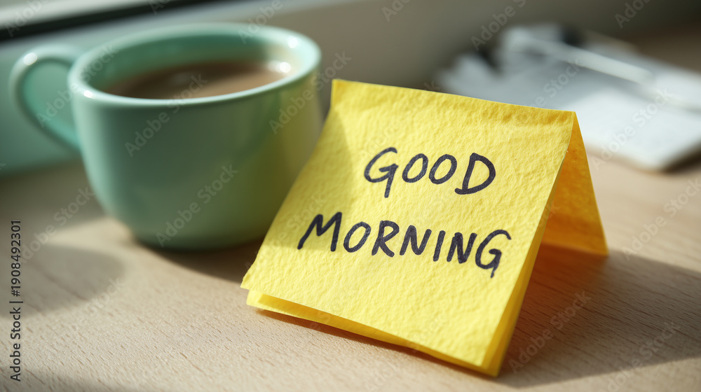 Good morning message on yellow sticky note with coffee cup by sunny window, cozy home morning routine atmosphere, soft natural light lifestyle concept #1908492301