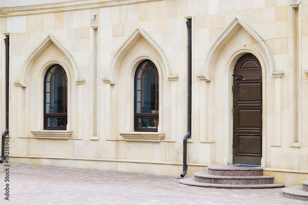 Gothic architectural details with arched windows and a dark wooden door on a stone building #1921896135