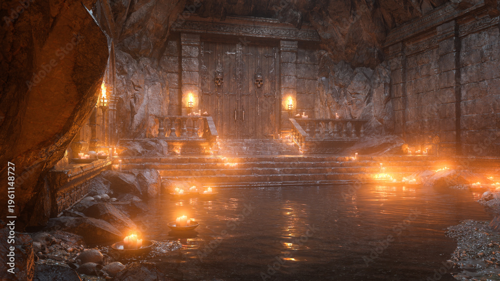 Gothic fantasy castle entrance lit by candles in a dark underground cavern with water. 3D render. #1961148727