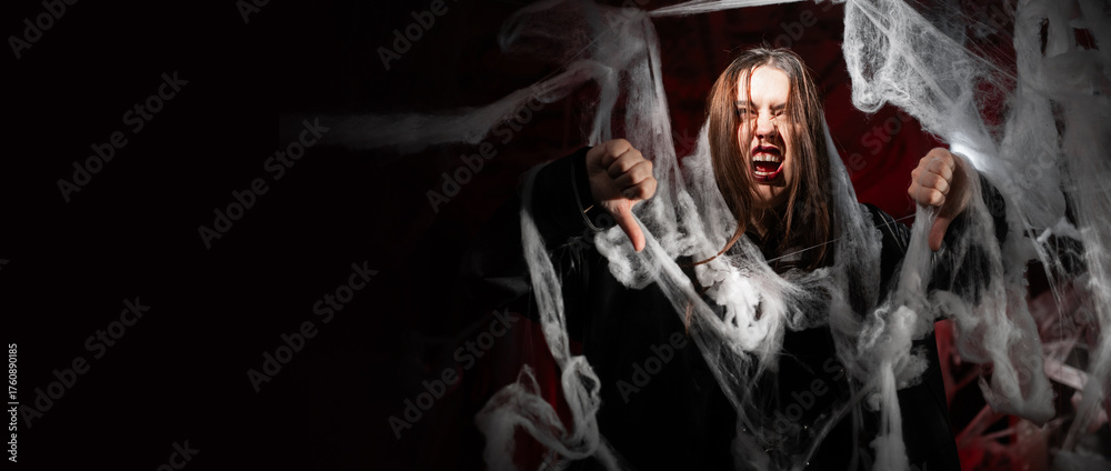 gothic woman with creepy vampire makeup trapped in spider web trying to scare, showing thumbs-down dislike gesture. Fantasy scary girl on red halloween background. #1760890185