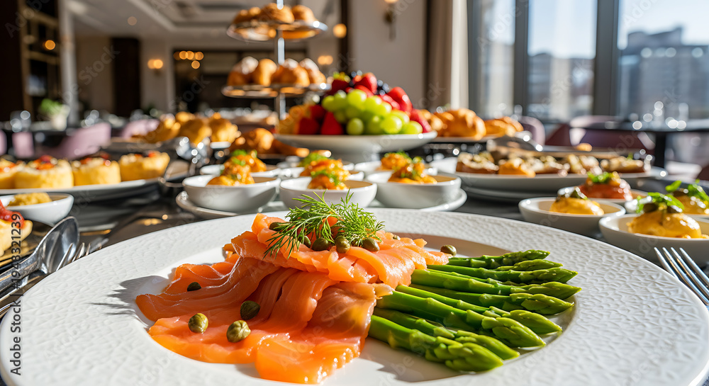 Gourmet brunch spread with smoked salmon, asparagus, pastries, and fresh fruit in a luxurious restaurant setting #1948321239