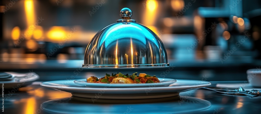 Gourmet dish, silver cloche, kitchen background #1907504756
