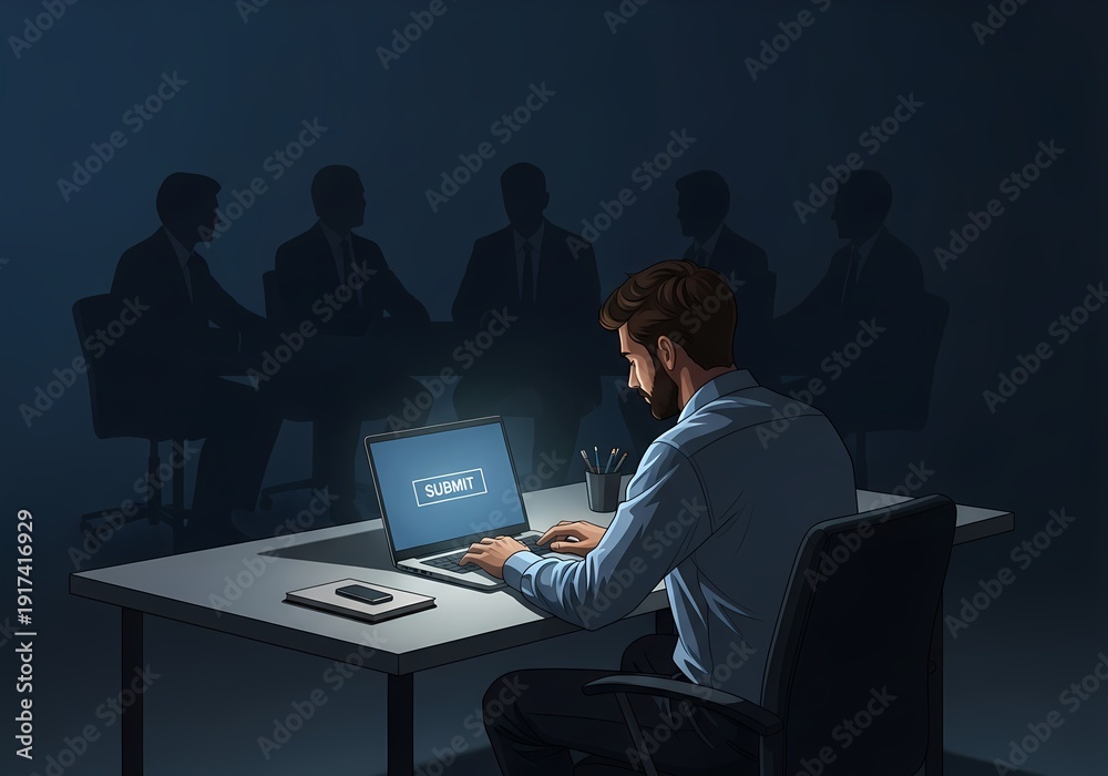 Government startup business plan submission moment, entrepreneur reviewing proposal under pressure, anxiety, anticipation and hope before final submit. #1917416929