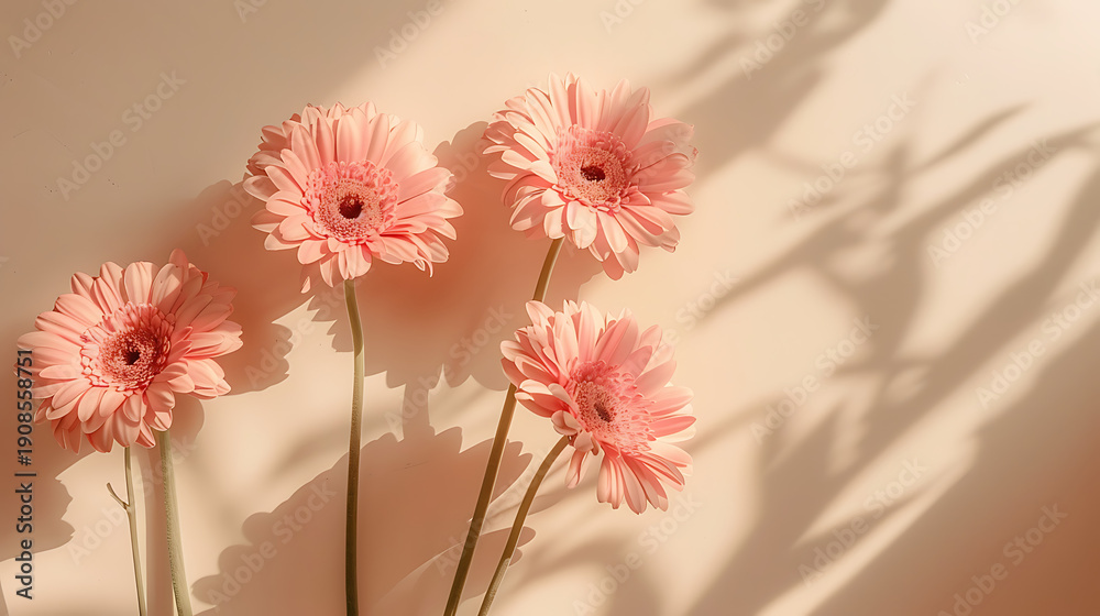 Graceful pink gerbera flowers in sunlight over tan background #1908558751