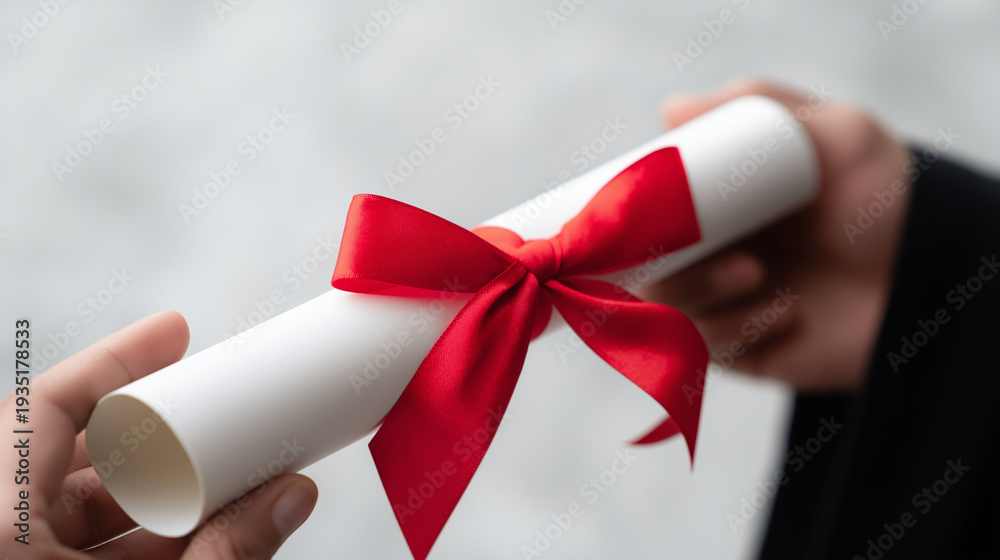 Graduate hands presenting a rolled diploma or certification degree scroll tied with red ribbon, symbolizing academic achievement, success, and completing an educational journey, copy space #1935178533
