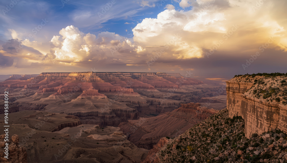 Grand canyon vista at golden hour with dramatic clouds and layered canyon rock formations #1949588092