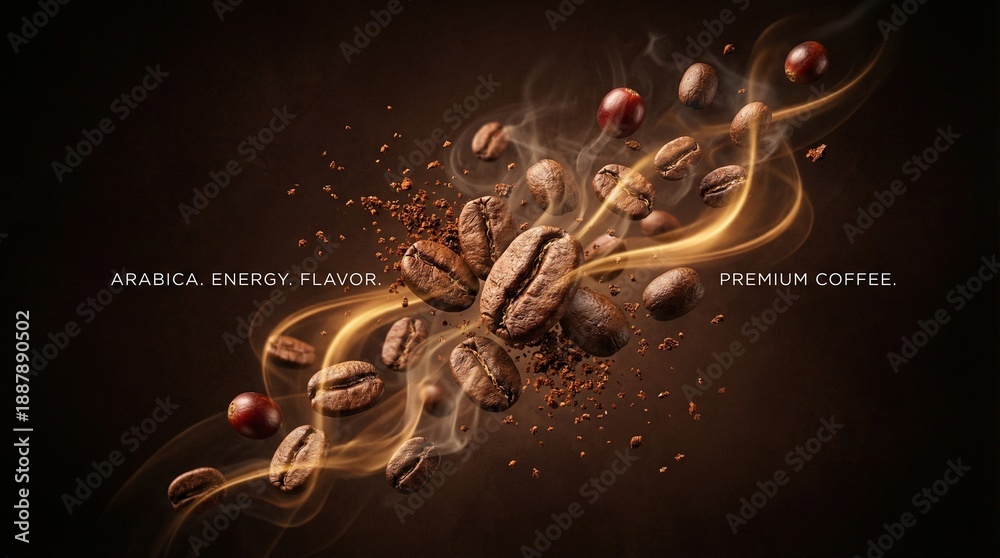 Granos de café arábica tostados explotan y levitan en el aire con fuerza y elegancia, capturados en una escena dinámica, intensa y llena de aroma sobre fondo oscuro. #1887890502