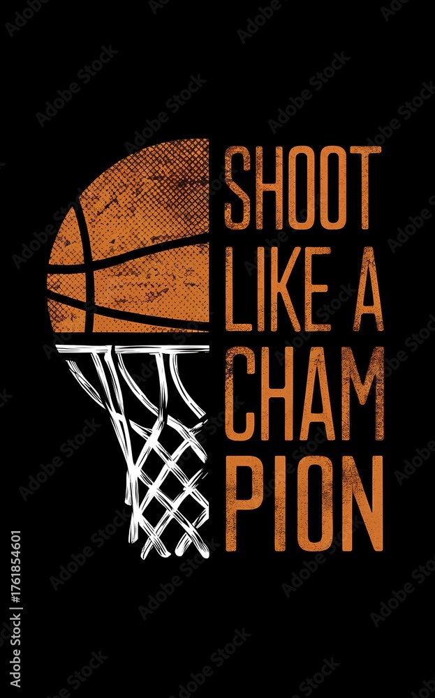 Graphic design featuring half a basketball above a net with the motivational slogan “Shoot Like A Champion” in grunge, retro style on a black background. #1761854601
