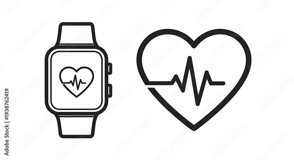 Graphic of a smartwatch showing a heart rate monitor beside a stylized heart with a waveform #1938762419