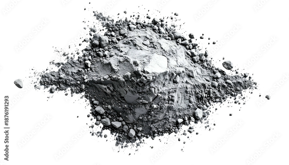 Gray, granular powder pile on black background, resembling dust, rock, or minerals #1876191293