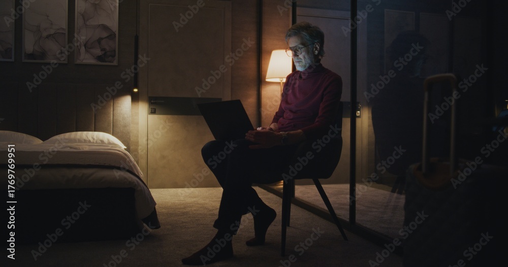 Gray Haired Businessman Wearing Glasses Sits in Modern Hotel Room, Typing on Laptop in Warm Glow of Night Lamp. Concept of Loneliness, Dedication Work, and Digital Rhythm of Modern Work. Static Shot. #1769769951