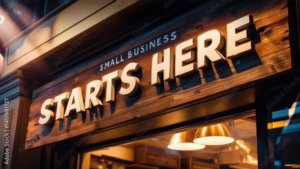 great depression Wooden sign displaying "Small Business Starts Here" inviting entrepreneurs and showcasing a warm, entrepreneurial atmosphere. #1417981727