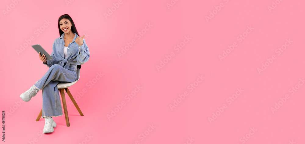Great Offer. Smiling young woman using tablet sitting on chair isolated on orange studio background, looking at camera and pointing finger aside, showing free copy space mockup advert, banner panorama #1917111059