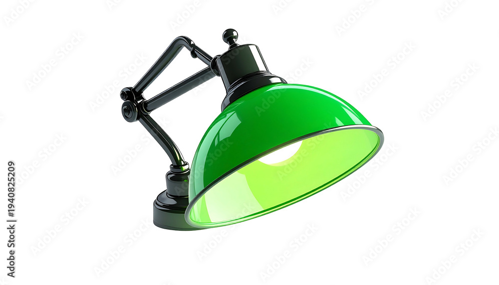 Green adjustable desk lamp shining bright light on black background studio shot #1940825209