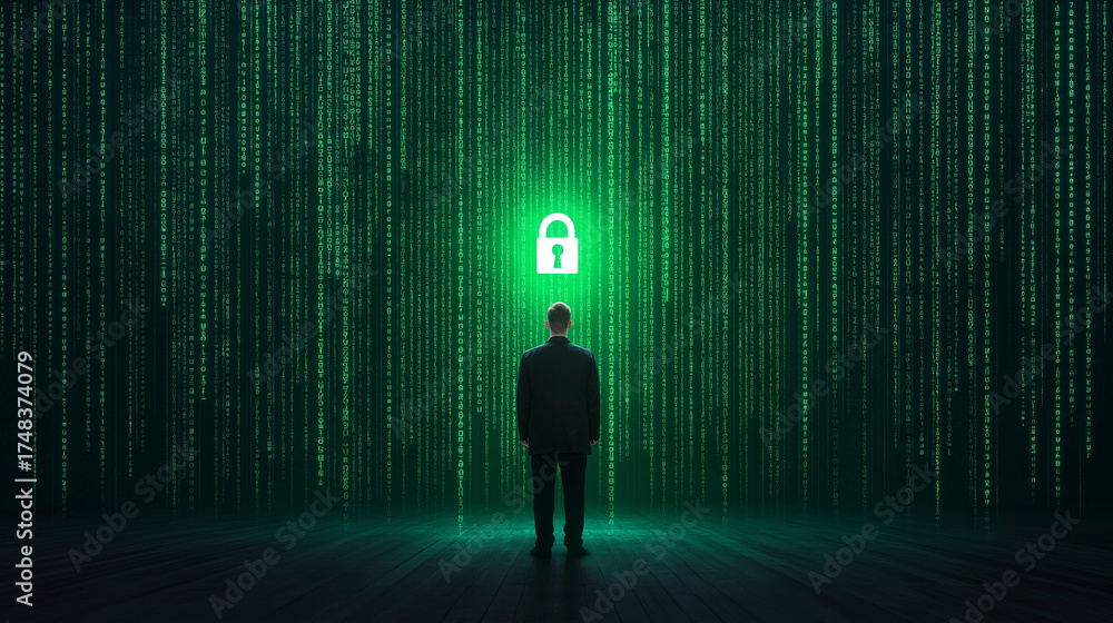 Green background for cyber security concept man with glowing lock #1748374079
