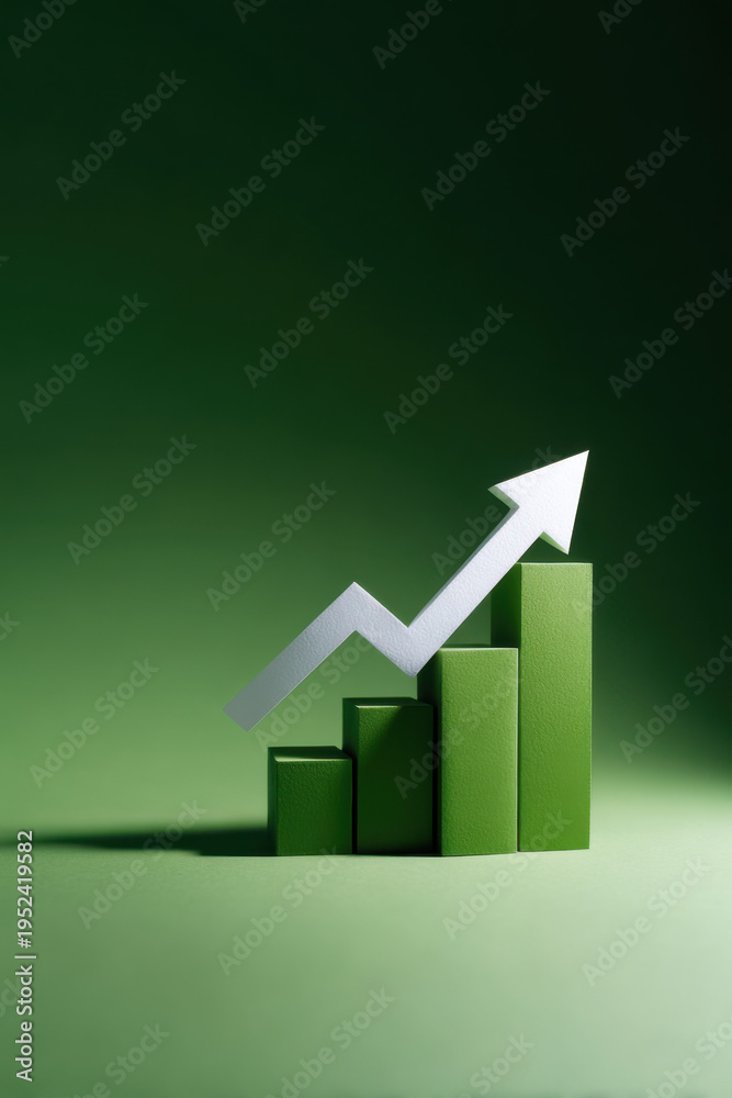 Green bar chart showing upward trend with white arrow indicating growth and increasing business success #1952419582