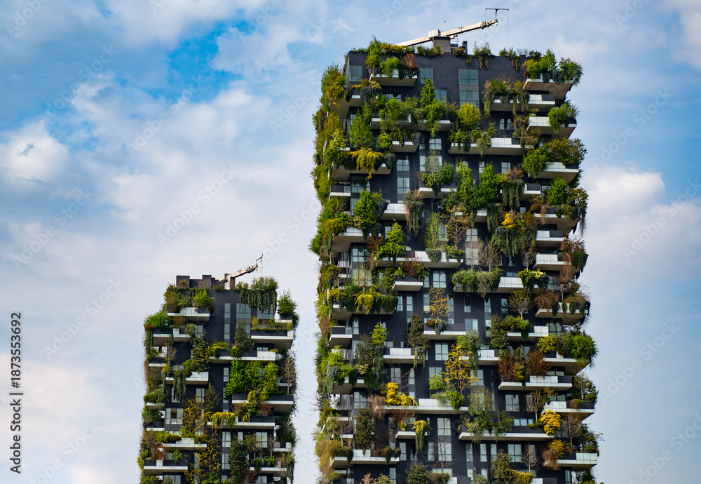 Green building with trees represents modern architecture in Milan. Bosco Verticale skyscraper. Sustainable architecture. Vertical forest tower in Italy. Modern apartments by greenery. #1873553692