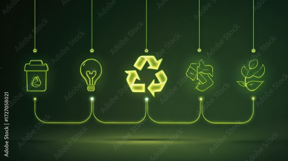 Green Concept of Recycling with Light Bulb, Water, Plant, and Trash Can Icons on Dark Background #1727058021
