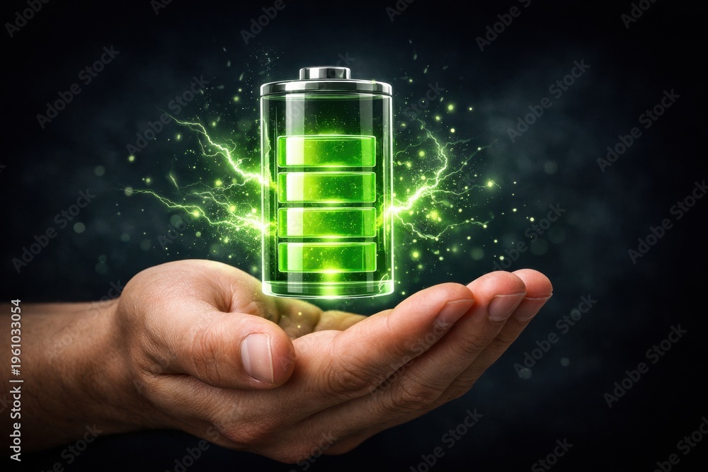 Green electric battery technology symbolizes energy storage held in human hand with glowing electric sparks illustrating power and innovation #1961033054
