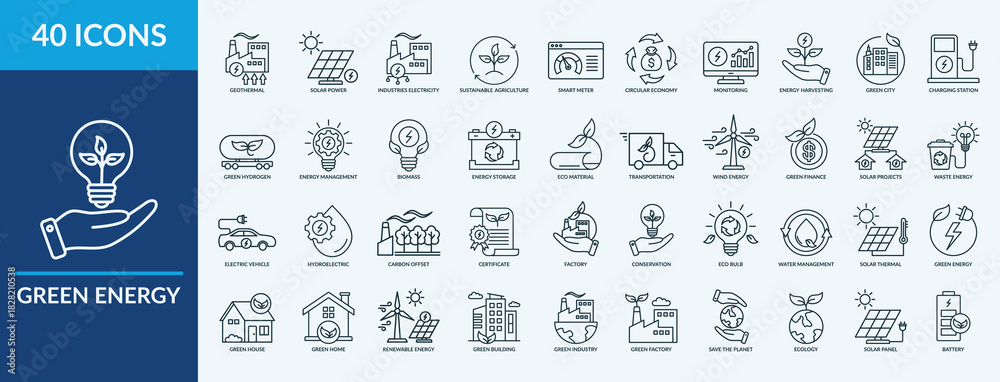Green energy icon set. Containing wind energy, solar power, geothermal, eco material and more. Outline vector icons collection #1828210538