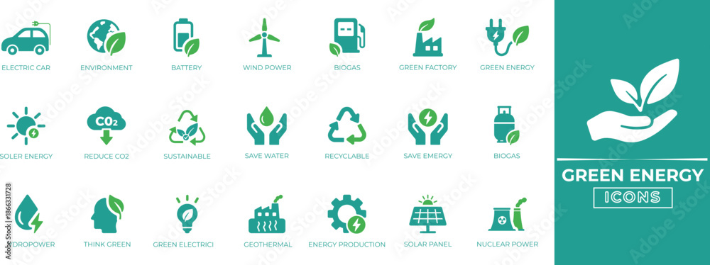 Green energy icon set with solar, wind, renewable, alternative, eco, sustainable power, and renewable energy symbols for websites, apps, and branding #1866331728