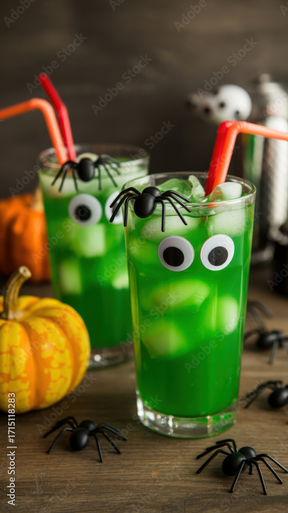 Green Halloween Punch with Spider Decorations and Orange Straws for a Festive Gathering #1715118283