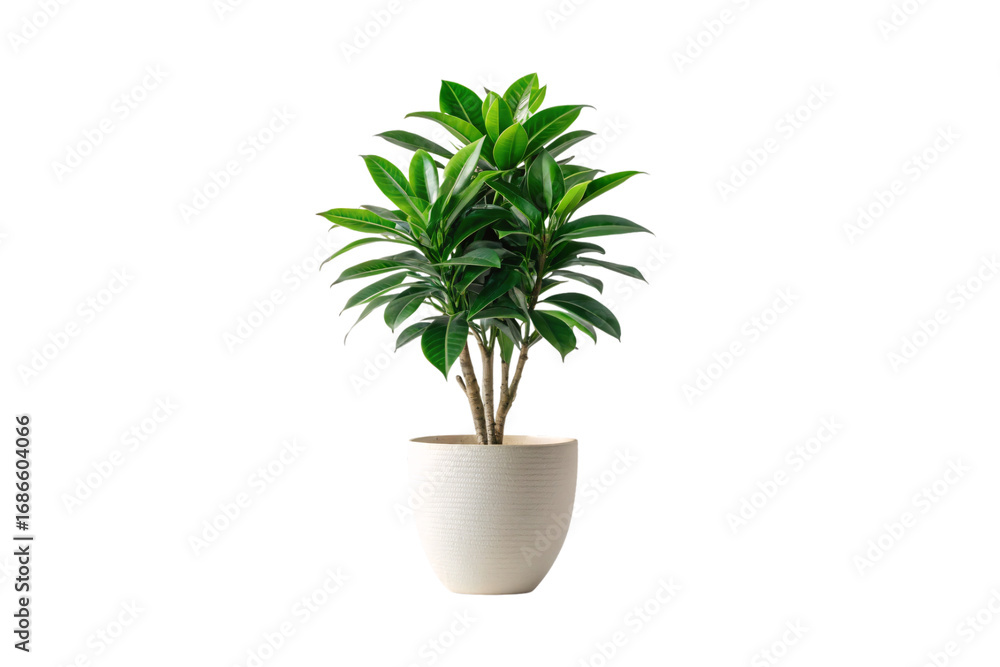 Green leafy houseplant with multiple stems in white ceramic pot displaying lush foliage growth, isolated on a transparent background #1686604066