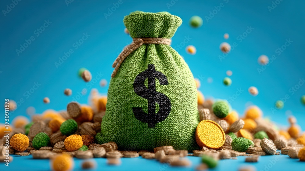 Green money bag with dollar sign surrounded by coins on bright blue background #1730911573