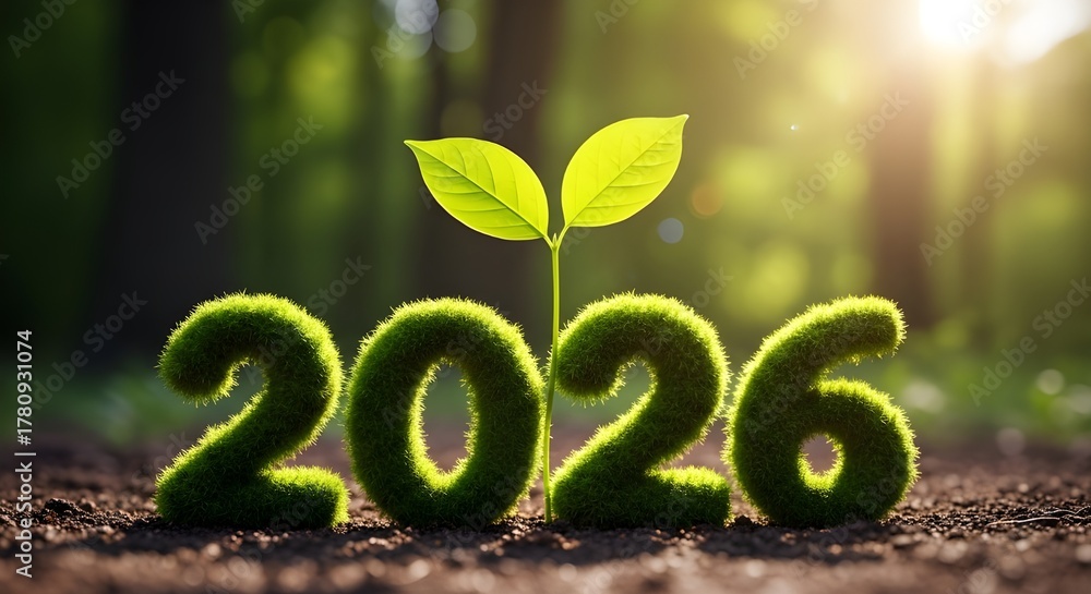 Green moss covered numbers 2026 growing with a small sprout and sunlight in a forest setting symbolizing growth and future #1780931074