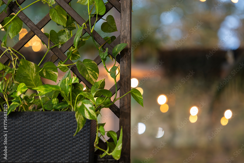 Green plant climbing on wooden lattice in a cozy, softly lit outdoor space #1775681202