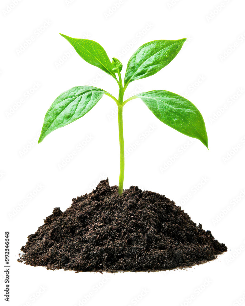 Green plant sprouting from rich soil, white isolated background. #992346648