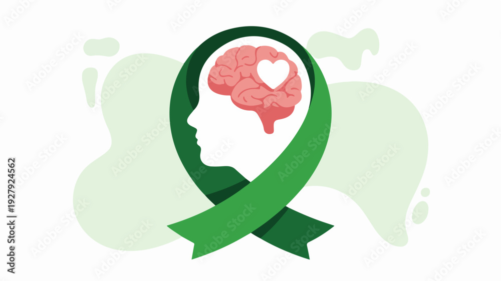 Green ribbon awareness symbol with pink brain and heart on white background for mental health support and care #1927924562