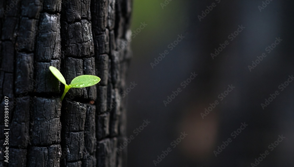 Green sprout growing from charred tree trunk in a forest #1931891407
